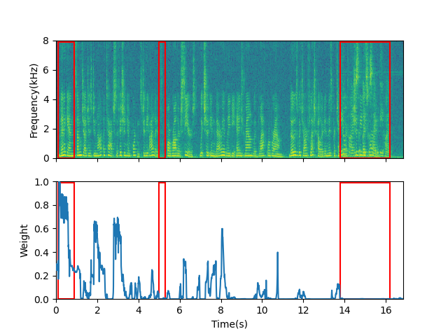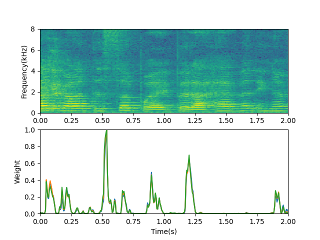 Visualization of the estimated weight. Three pairs of blocks from left to right refer to speech of target speaker, silent frames and overlapped speech, respectively.